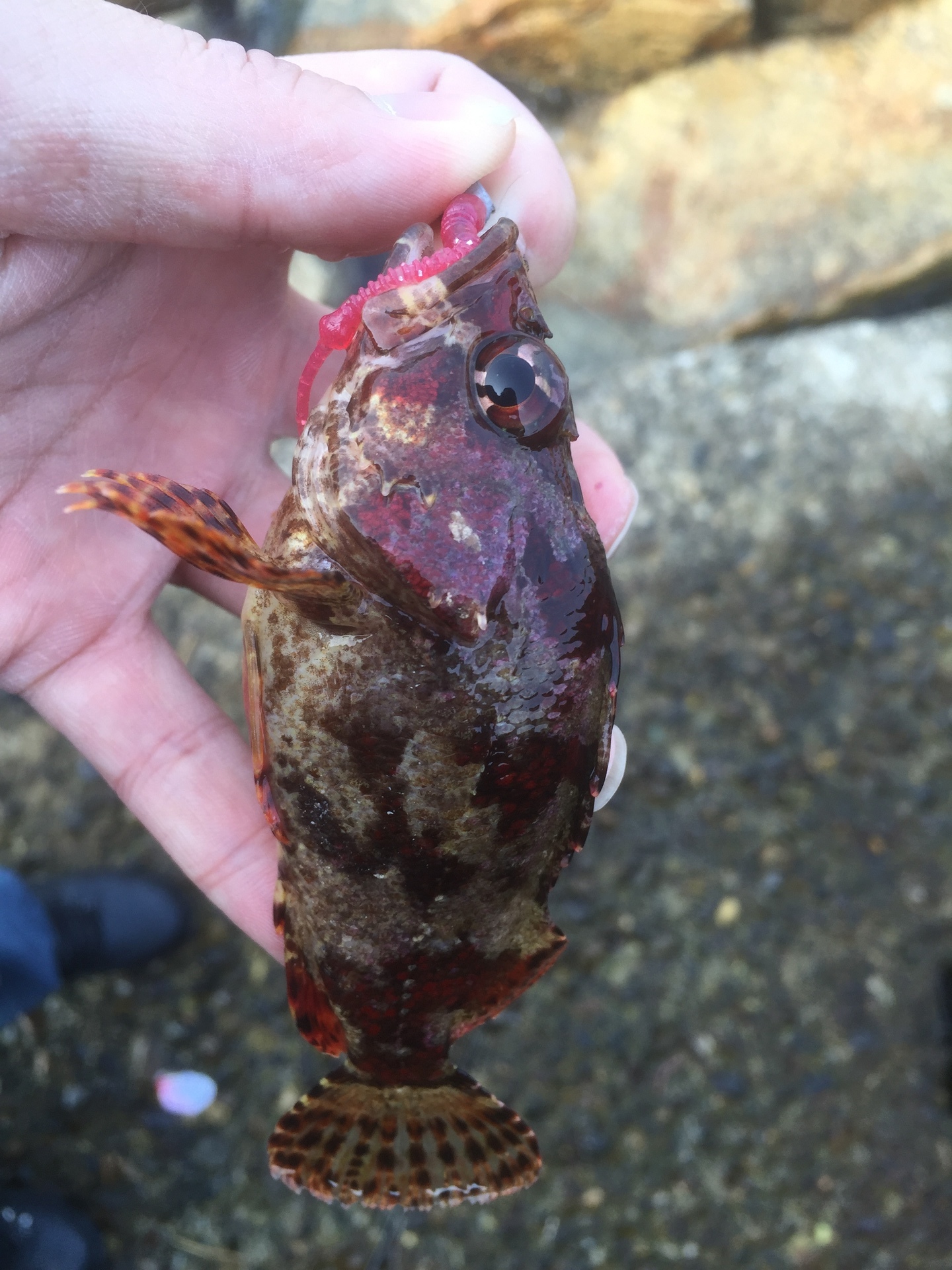 そんなわけで前にアジ・メバルが釣れた、岩がゴロゴロあるエリアまで移動。